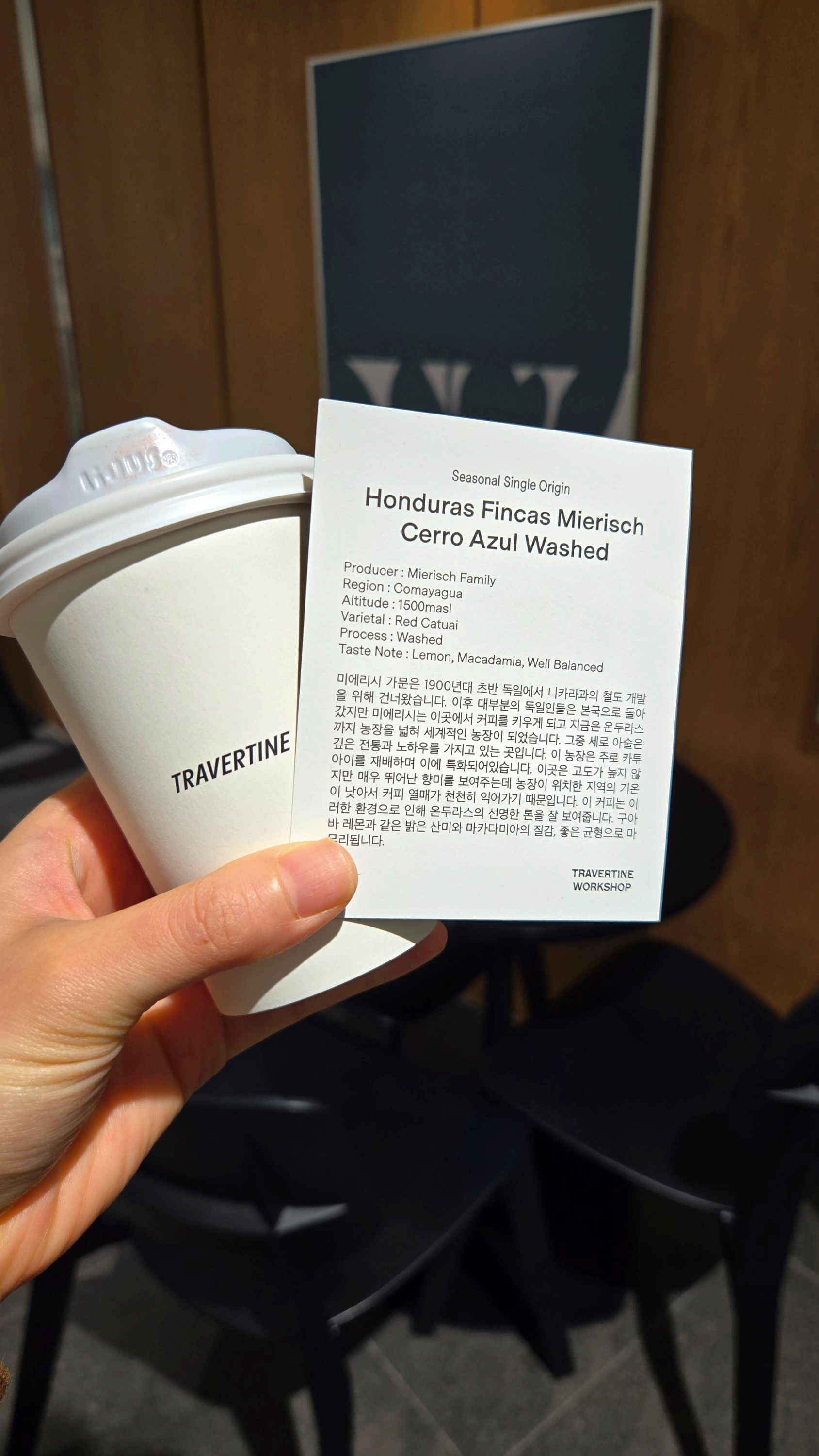 뭐가 어찌되었든 트래버틴의 필터 커피 라인업은 언제 봐도 좋다. 항상 2~3가지씩 시켜 골고루 마셔보고 싶게 만든다. 이날은 온두라스를 골랐다. 최근 온두라스의 균형미에 상당히 사로잡혀 있는데 때마침 온두라스 필터가 있길래 특별히 고민할 새도 없이 바로 주문을 했다.